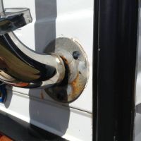 We're not quite sure how the scratch got there we assumed it happened during the installation of the grab rail proberbly wasn't even noticed. Once paint is removed exposing the bare aluminum to the atmospere corrosion would start. I though there was a lot of corrosion for only three and a half years so I deduced that water was being trapped behind the concealment cap. The mounting plates have nickle in them so where both the nickle mounting plate and bare aluminum were in contact together and in water electrolysis would have occured and the aluminum wall of the caravan would have become the sacrificial anode depositing corrosion onto the mounting plate.