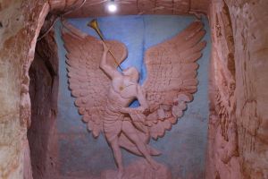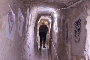 The Chamber of the Black Hand is a mine of two levels the upper level containing wall carvings while the lower level is where the mining is still done. The upper level is accessable by a long staircased ramp going down about 45 metres. The tour starts in the lower level which is accessable via another tunnel which goes down 60 metres where a knowlegable guide shows you through the workings of the mine describing the process of opal mine as he goes.