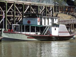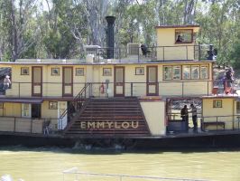 We picked the Emylou lunchtime cruise which goes for an hour and a half travelling upstream taking us past the caravan park we are staying at. The lunch is an extra and can be purchased while onboard. I though the cost was a little expensive but the meal was very nice. The paddle boat is driven by a working steam engine with the boiler fired using local redwood timber. As we sail along the Captain gives a comentary on local history and recounts stories as we pass other paddle wheeler boats.