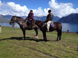 Day 9 Queenstown Morning broke to another fine day although once again a little cold. There was another fresh dump of snow visible up on The Remarkable mountains. Today there were a number of tours booked, John and Leila were off to Milford Sound via a scenic flight with the rest of us heading for a lake cruise and horse trek. John an Leila left early being picked up by the tour company. The rest of us jumped in the bus and headed for a parking spot near the lake. Parking is difficult in Queenstown with all the free and cheap parking gone by early morning. What left was $2.00 per half an hour with a max of $12.00 for a whole day up to 9 am.