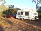 For travelling we had a 16' 9" single axle Freedom Poptop being pulled by a six cylinder Ford EL Falcon sedan. While not the ideal setup for a long trip it servered us well, travelling up and back without a problem with either the car or van. We did a few enhancements such as installing a 100 amp hour 12 volt battery in the boot and two 60w solar panels on the roof. We also added a porta pot wich lived under the bed untill it was needed but apart from that the van and car was pretty much standard.